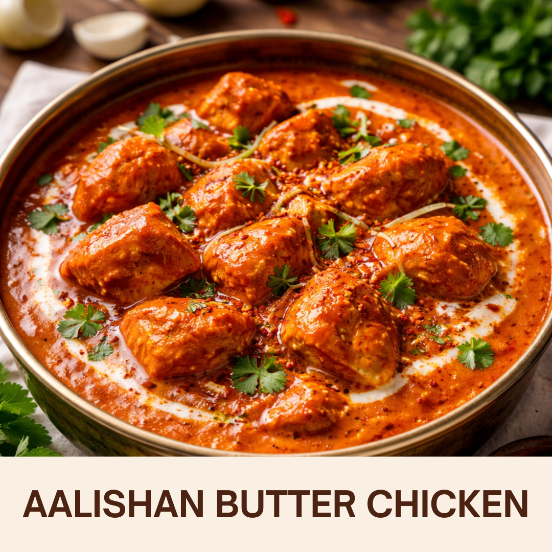Aali shan Butter Chicken– Tender chicken simmered in a rich, buttery tomato gravy with subtle spices. Aali Shan Butter Chicken is a royal non-veg classic, creamy, flavorful, and indulgent.