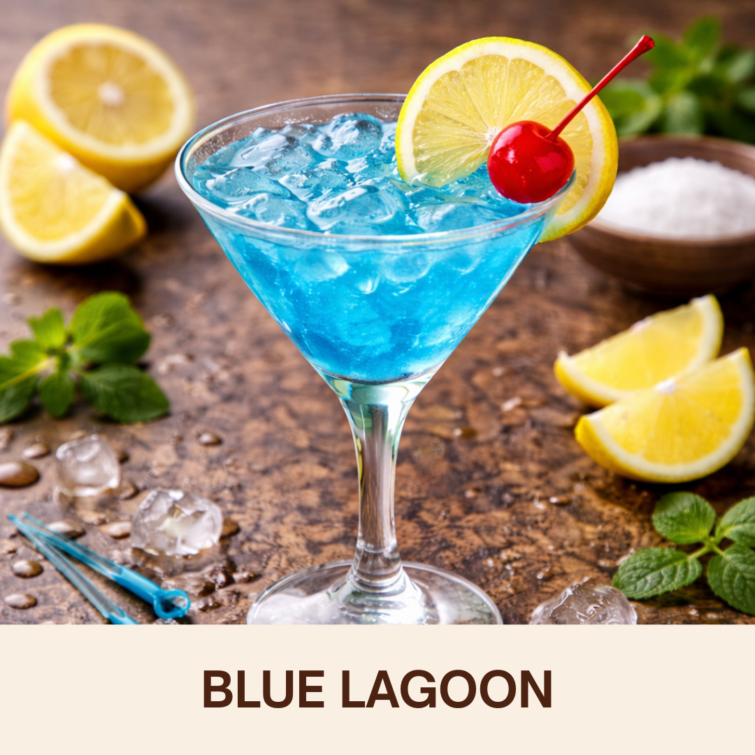 Blue Lagoon- A refreshing blend of citrus flavors and blue curaçao, chilled to perfection.