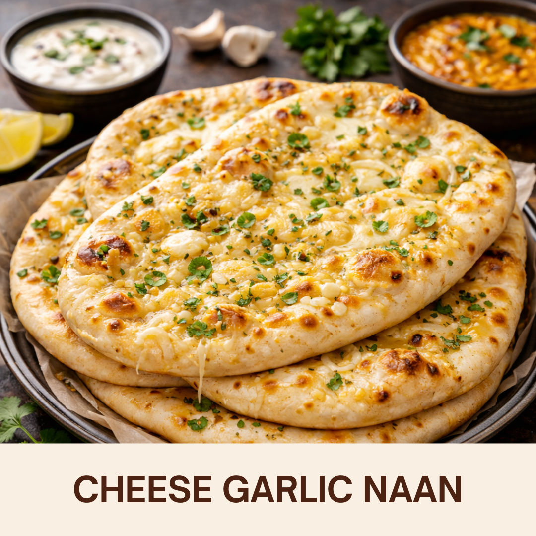 Cheese Garlic Naan- Soft naan stuffed with melted cheese and fragrant garlic, baked to perfection. Cheese Garlic Naan is a rich and indulgent veg bread loved for its creamy flavor.