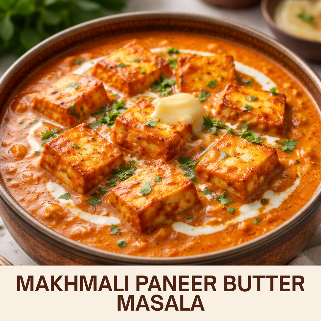 Makhmali Paneer Butter Masala-Soft paneer cubes simmered in a smooth, rich, buttery tomato gravy. Makhmali Paneer Butter Masala is a luxurious veg classic with creamy, melt-in-the-mouth flavors.