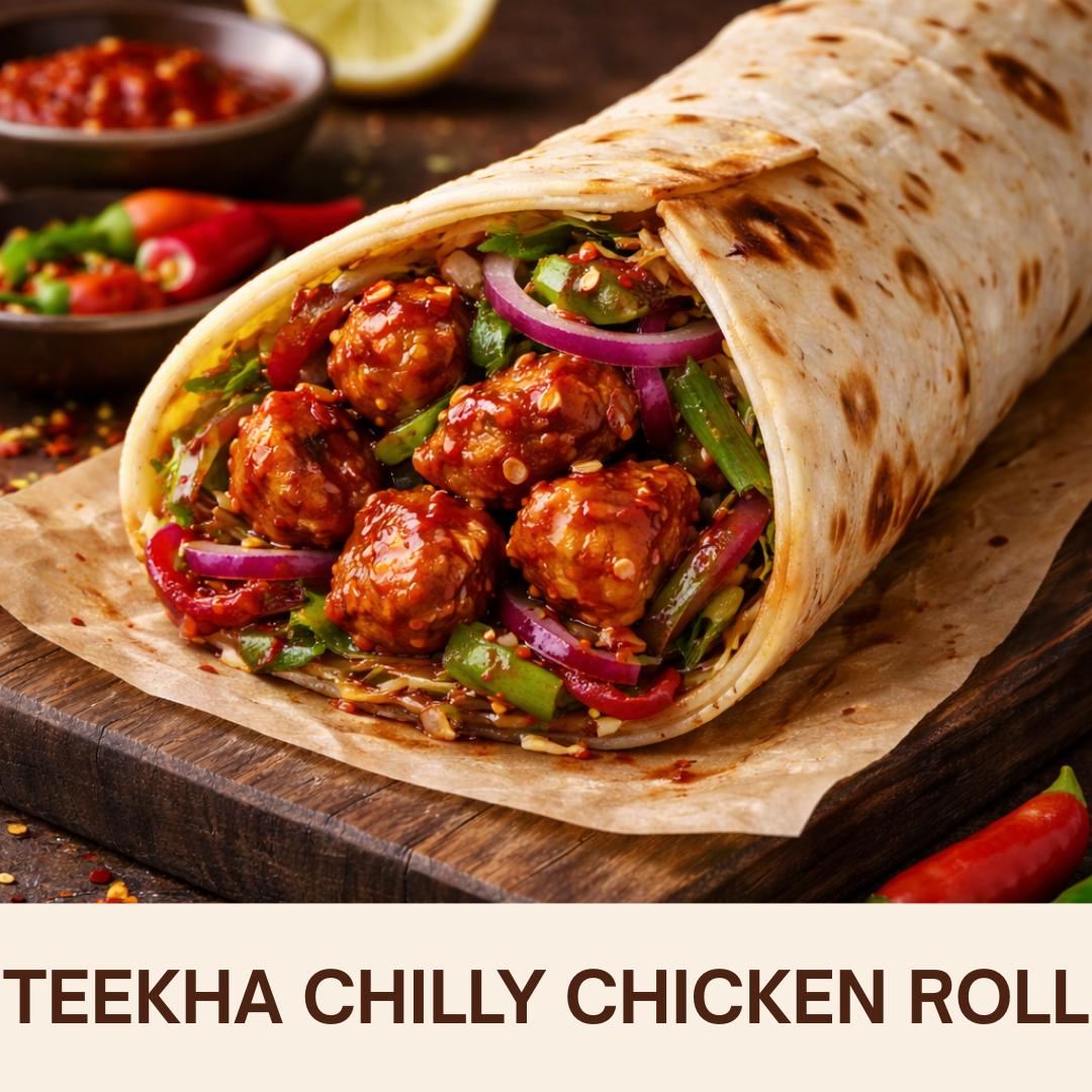Teekha Chilly Chicken Roll– Spicy chili chicken wrapped in a soft roll with tangy sauces and onions. Teekha Chilly Chicken Roll is a fiery non-veg snack packed with bold flavors.